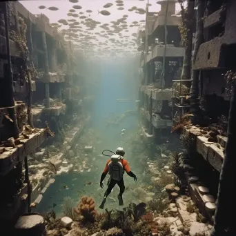 Generates an image of a diver exploring a vibrant, underwater city while swimming among colorful coral reefs and exotic marine life. The scene is filled with vivid colors and intricate marine details, creating a mesmerizing underwater world.