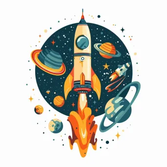 An emblem-style logo depicting a cosmic exploration agency with a rocket launching into space past stars and planets.