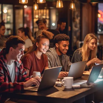 A lively scene of friends collaborating on laptops in a café bustling with energy and soft lighting.