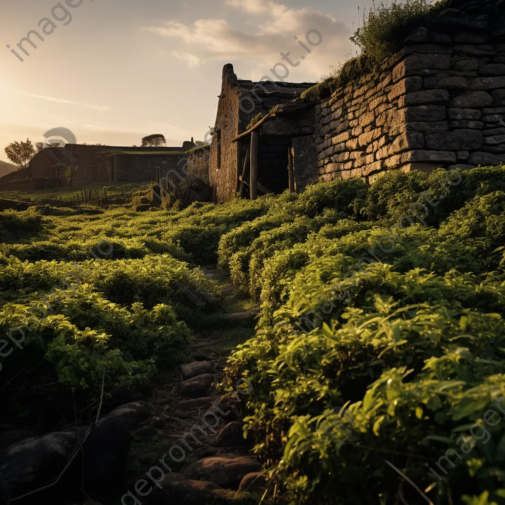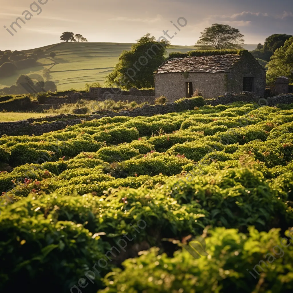 A landscape showing fields of tea at various growth stages with historic stone walls, bathed in soft afternoon light.